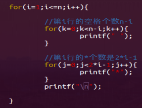 第n行,打印空格j=n-n,打印* k=2n-1;