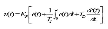 圖3 微分控制器曲線 微分反應(yīng)了偏差信號的變化規(guī)律,或者說是變化趨勢,偏差的微分實際偏差的變化速率,變化越快,其微分絕對值越大。偏差增大時,其微分為正;偏差減小時,其微分為負(fù)?刂破鬏敵隽康奈⒎植糠峙c誤差的微分成正比,反映了被控量變化的趨勢。根據(jù)偏差信號的變化趨勢來進(jìn)行超前調(diào)節(jié),從而增加了系統(tǒng)的快速性。Td值越大,超前控制作用就會越明顯,可以在做到提前控制。比例僅僅是偏差的放大增幅,表示當(dāng)前調(diào)節(jié)參數(shù),微分是預(yù)測偏差的變化,相當(dāng)于提前加入了控制數(shù)據(jù)。在比例微分調(diào)節(jié)器中,能夠提前控制偏差,也有可能出現(xiàn)負(fù)值,避免了惰性系統(tǒng)的超調(diào)現(xiàn)象。 一、PID算法內(nèi)容 2.1 PID算法選擇 PID算法中有比例積分調(diào)節(jié)(PI),比例微分調(diào)節(jié)器(PD),可根據(jù)系統(tǒng)要求進(jìn)行選擇,通常為了改善調(diào)節(jié)品質(zhì),往往把比例、積分、微分三種作用組合起來,形成PID調(diào)節(jié)器。理想的PID微分方程為: