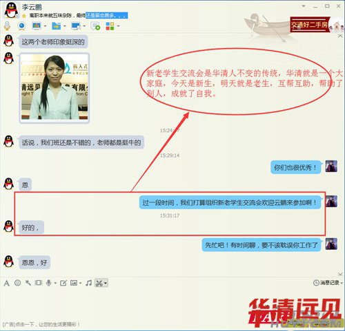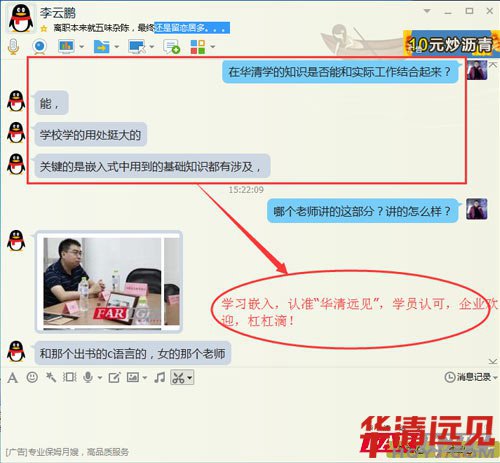 與很多華清的畢業生一樣,云鵬是華清萬千學子的一員。畢業后分配到華清的合作單位就業,從事嵌入式研發工作。云鵬同學對老師的回訪很是配合,交流起來不禁讓我感動,多么感恩的孩子啊!對教過他的老師這么的關注,讓我這個不參與教學的老師好生羨慕。感恩,是一種品行。相信懂得感恩老師的學生,在家一定是個好孩子,在企業是個好員工,相信他帶著這顆感恩之心,會越走越好!