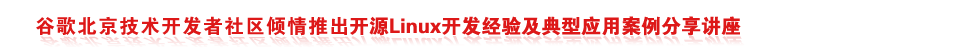 | 谷歌開發者社區GDG(原谷歌技術用戶組GTUG),將于6月15日(周六)下午1:30-5:00,在北京翠宮飯舉辦一場開源Linux開發經驗及典型應用案例分享講座,培訓講座中將通過三個專題與眾多開源Linux技術愛好者一起分享嵌入式Linux及Android開發的高級應用進階技術,以大家進入Linux開發高級應用領域。 活動限額300名,先到先得!我們將根據注冊的先后順序、選擇場地能夠容納的人數給您發參加講座的確認信。若超出場地容納限制,我們會邀請這次不能來的朋友們參加我們未來舉辦的同樣的活動。后續北京谷歌開發者社區將陸續舉辦同樣的活動,盡量滿足更多開發工程師和技術愛好者的需求,歡迎您來參加! |