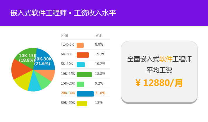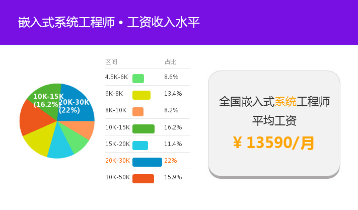 據統計:目前全國嵌入式工程師平均薪資可達近13000元,其中薪資在20k-30k之間的占比有21.4%。而一線城市,如北京、上海、深圳等地,嵌入式工程師平均薪資更是高達16000元/月以上。由此可見,不管是現在還是未來,嵌入式工程師都會是企業發展不可或缺的一部分。