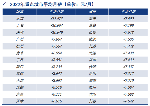 先給大家放張2022年中國重點(diǎn)城市的平均月薪調(diào)查表(如下):