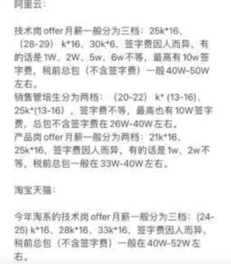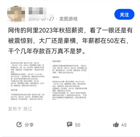 近日,華妹在網上看到一名網友發文:網傳的阿里2023年秋招薪資,看了一眼還是有被震驚到,大廠還是豪橫,年薪都在50左右,干個幾年存款百萬真不是夢。這一爆料,在網上引起了網友熱議,瞬間成為焦點。