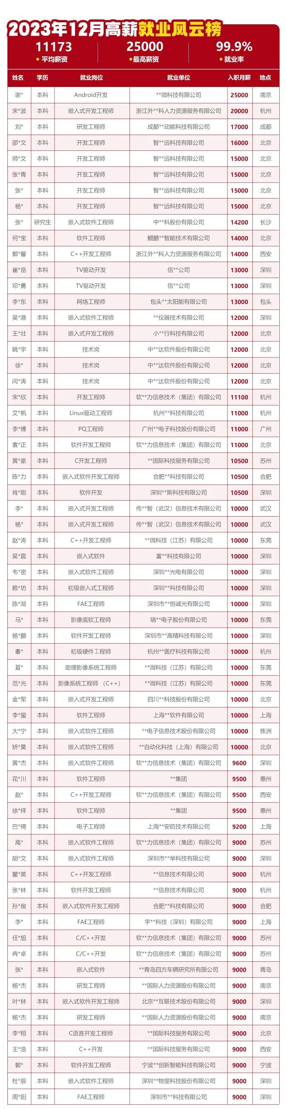 如果你還在糾結,那么華妹給大家直觀地展示一下華清遠見2023年12月高薪就業學員信息,平均薪資1W+,最高薪資25000,就業率99.9%。