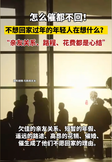臨近春節(jié)回家高峰,“怎么催都不回!”的話題在某音傳開(kāi)了。有人猜想這些不想回家過(guò)年的年輕人在想什么?是飄洋過(guò)海的歸途,是舍不得花掉的昂貴車(chē)費(fèi),還是話不投機(jī)半句多的親朋好友呢?