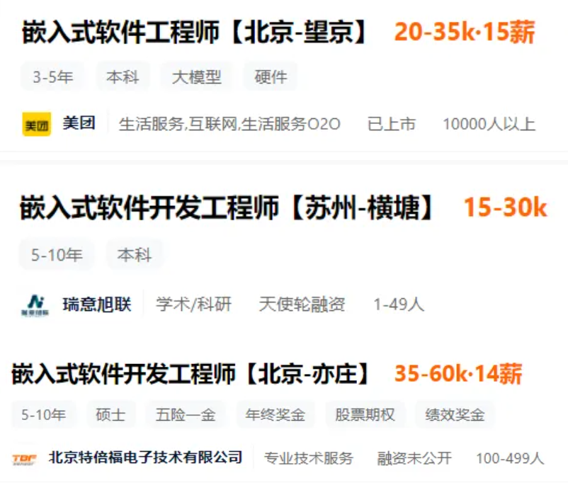 近年來因芯片、汽車電子等領域爆發,嵌入式高薪崗位需求逐漸增多。如美團招聘嵌入式軟件工程師,北京地區,薪資20-35K*15薪,年薪高達50W+。