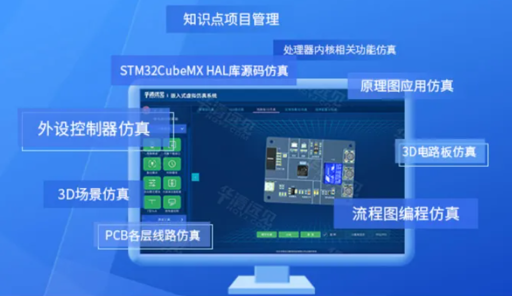 平臺教學功能模塊涵蓋了從3D電子元器件介紹,到外設控制器工作原理與寄存器配置,再到原理圖仿真驗證、PCB各層線路仿真、3D電路板仿真、流程圖編程仿真、STM32CubeMX+HAL庫源碼仿真,RTOS操作系統LVGL界面開發,直至3D應用場景的全流程仿真。