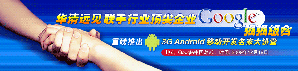 作為Google公司Andriod平臺技術推廣的合作伙伴,華清遠見3G學院應廣大移動開發技術愛好者的需求,隆重推出此次3G Andriod移動開發名家大講堂,以期待更大范圍地推廣和普及Andriod平臺軟件開發技術。本次講座的活動地點安排在Google大樓,華清遠見眾多移動開發專家將在Google總部聯手為大家全方位呈現在3G Andriod移動開發領域內從底層開發到應用開發,從行業現狀分析到技術應用發展趨勢等豐富內容,以幫助廣大技術愛好者更好體驗在Andriod平臺上3G移動開發全真案例的完整實戰過程,真實感受3G移動開發領域內的核心技術應用和標準開發流程、規范。