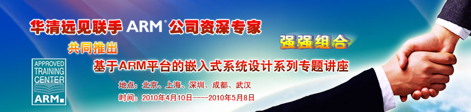 作為早推出ARM開發高端培訓課程的專業嵌入式培訓機構、首家ARM公司全球授權培訓中心(ATC),華清遠見在業界一直享有極高的聲譽。此次應眾多嵌入式開發專業人士及技術愛好者的要求,華清遠見專家聯手ARM公司資深專家,分別在北京、上海、深圳、成都及武漢重磅推出系列專題講座,和大家一起共同分享基于ARM平臺的嵌入式系統設計,內容涉及硬件及軟件,大家進入ARM平臺營造的專業嵌入式開發領域!