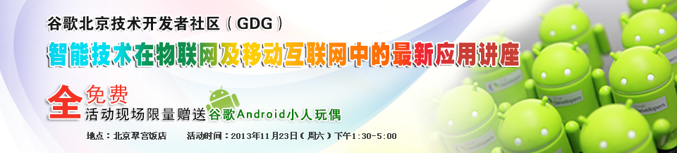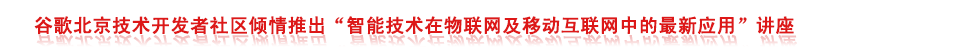 谷歌開發(fā)者社區(qū)GDG(原谷歌技術(shù)用戶組GTUG),將于11月23日(周六)下午1:30-5:00,在北京翠宮飯店舉辦一場智能技術(shù)在物聯(lián)網(wǎng)及移動互聯(lián)網(wǎng)中的新應(yīng)用講座,培訓(xùn)講座中將通過三個專題與眾多嵌入式、物聯(lián)網(wǎng)及移動互聯(lián)網(wǎng)愛好者一起分享物聯(lián)網(wǎng)新技術(shù)熱點及應(yīng)用案例分析,及時把握行業(yè)新技術(shù),了解行業(yè)新動態(tài)。