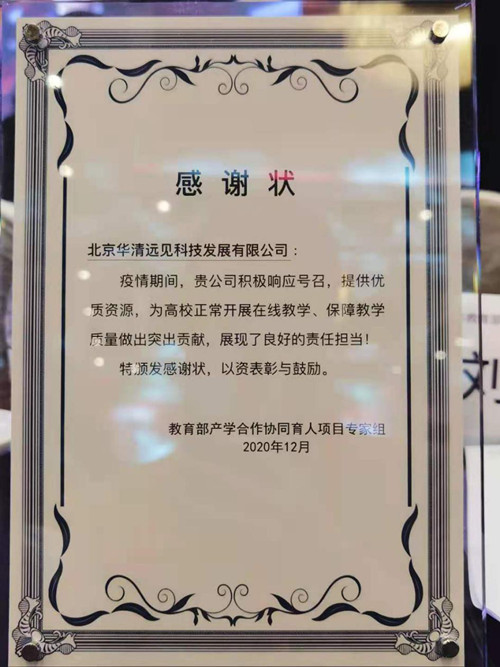 華清遠見獲教育部產學合作協同育人項目專家組頒發感謝狀