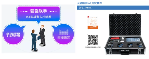 華清遠見和阿里云合作升級了物聯網專業課程體系,引入天貓精靈IoT開放平臺進行項目開發與學習,共同打造IoT實戰型人才。同時研發中心也自主研發了用于高校教學實訓用的天貓精靈IoT開發套件,可實現AIoT技術項目落地。在2020年年底,我們與阿里云一起舉辦的“阿里云物聯網百校公益行”活動也已經全面展開。
