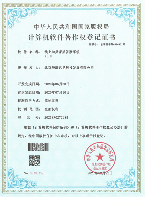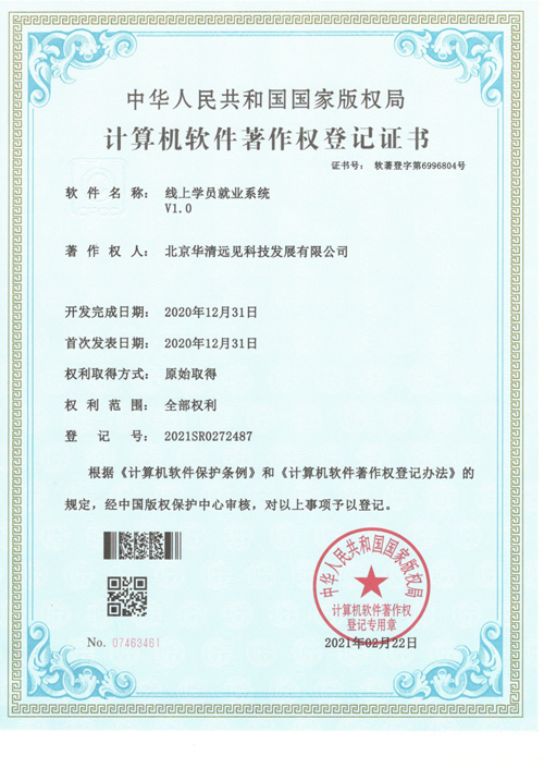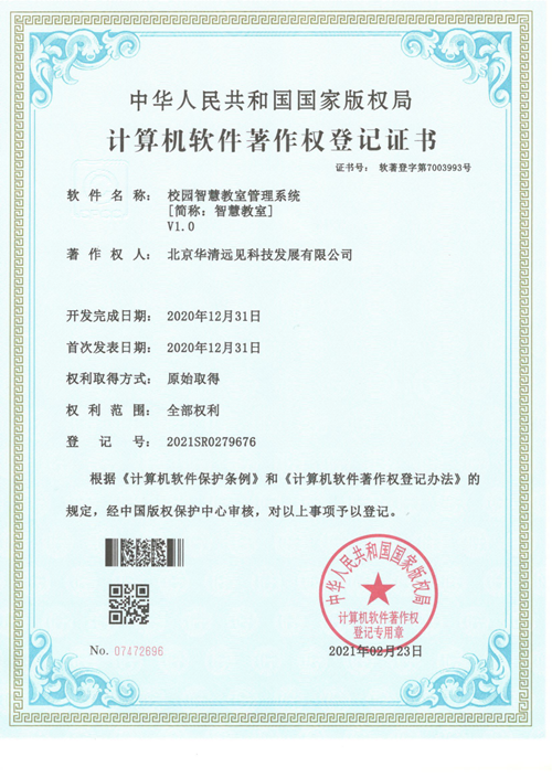 近日,華清遠見自主研發的《校園智慧教室管理系統V1.0》、《線上學員課后答疑系統V1.0》、《線上學員就業系統V1.0》3項軟件技術獲得國家版權局注冊頒發的計算機軟件著作權登記證書。截止目前,華清遠見已經累計榮獲計算機軟件著作權登記證書達40余項。