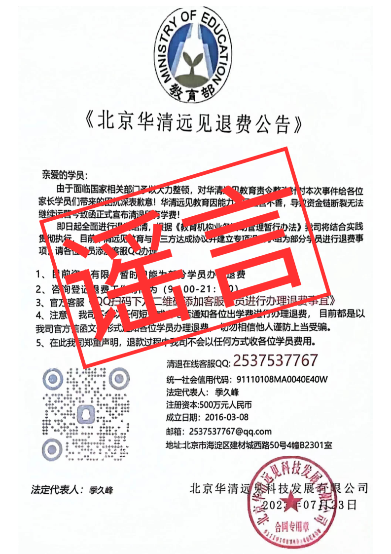 近日,北京華清遠見科技集團有限公司(以下簡稱“我司”)發(fā)現(xiàn)有不法分子偽造國家機關(guān)和華清遠見企業(yè)文件,以辦理退款為由,以“華清遠見”名義發(fā)布相關(guān)虛假文件、建立QQ群,誘導學員加好友、加退款群、手機短信等非法手段對用戶實施詐騙行為。