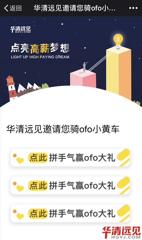 現華清遠見聯名ofo小黃車,免費送你三張手氣卡!里面包含月卡、周卡和各種折扣卡哦!至于你能拿到哪一張?嘿嘿,全靠你的手氣啦~