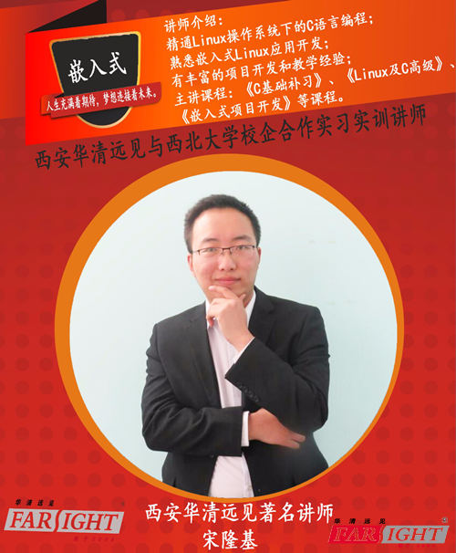 此次實習實訓講師由西安華清遠見著名講師宋隆基老師講解,宋老師有豐富的項目開發和教學經驗,精通Linux操作系統下的C語言編程和Linux應用開發。