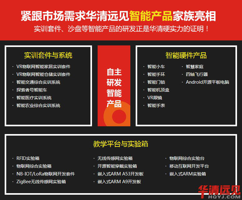 為激發學員的學習興趣,滿足學員體驗動手開發的樂趣,華清遠見順應市場大勢,推出了10余套智能硬件產品與實訓項目,包括智能家居、智能交通、智能醫療、智能農業、智能倉儲物聯網系統等。除此之外,華清遠見在研發方向上也有不菲的成績。成立15年來,已經自主研發了實驗教學平臺60余套,提供嵌入式/物聯網/大數據/云計算/VRAR等高校實驗室解決方案,并應用于千余家合作院校及企業,其中20余例研發成果獲得國家專利;出版專業圖書教材近90本,適用于各大高校課程中。華清遠見以“培訓+研發”雙引擎,共同打造智能硬件行業硬實力,讓學科實驗更豐富!