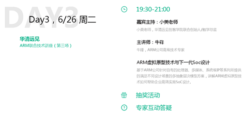 此次技術講座主題為:ARM引領智能物聯新時代/最新ARM微控制器在物聯網系統中的應用案例/ARM虛擬原型技術與下一代SoC設計/最新ARM+Android智能終端設計案例。講座為期4天,分別是6月19日、6月21日、6月26日、6月28日。