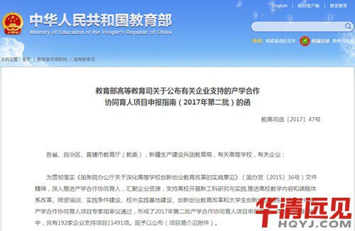 10月份,教育部高等教育司公布了2017年第二批產學合作協同育人項目獲批立頂的企業情況。其中,華清遠見教育集團申報的4個項目(教學內容與課程體系改革、師資培訓、實踐條件建設、大學生實習實訓)成功獲得審批,為進一步深入開展產學合作提供了新的平臺和契機,實現了通過校企共建達到產教融合,共同培育企業急需實用人才的目標,有效地提升了大學生創新創業能力。