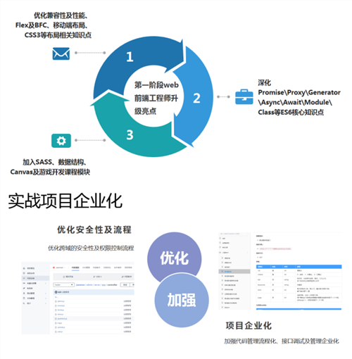 學生反饋JS很重要,我們全面加強該課程深度及廣度,并全面加重ES6,授課時長提升1倍。學生反饋Vue、React市場需求大,我們把Vue、React項目時長擴展到6周。企業級項目經驗不足方面,我們進一步深化Team合作、代碼版本管理、接口測試及管理、真實場景項目打包及發布等課程內容。