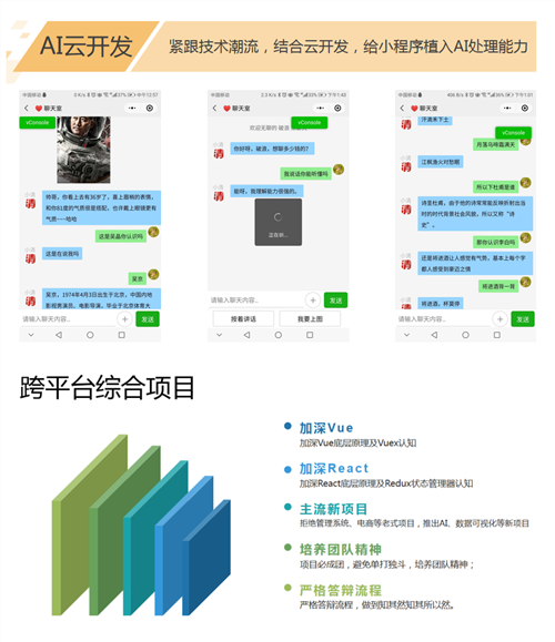 我們堅定以基礎為基礎,以未來為未來。學生能做出項目只是最基本的要求,我們更關注學生的職業發展高度。在課程設計上,更側重基礎部分,形成完整的知識體系及編程思想,通過原理掌握框架。比如在我們課程中加入了數據結構、云開發、AI應用開發等。