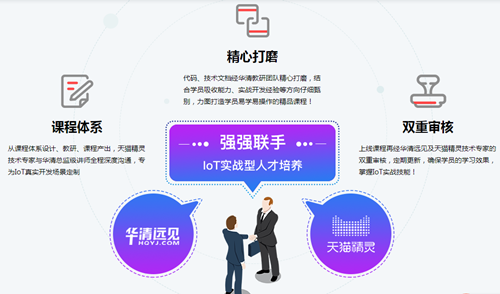 為此,華清遠見和天貓精靈走到一起,依托華清遠見在IT培訓領域方面的品牌影響力和教學實力,并融合企業實戰技術和產品能力,攜手設計研發教育培訓課程,培養物聯網高端技術人才。