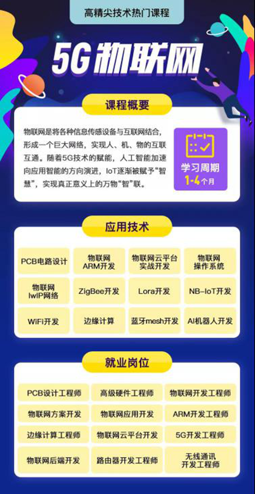 當互聯網的上半場結束之后,所有的互聯網下半場都是重生意。隨著AIoT越來越熱門,各企業不約而同的押注AIoT,伴隨著5G的到來,AIoT的加速擴張將會進一步促進萬物互聯的真正實現,而具有項目實戰經驗的IoT技術應用型人才將成為這一過程中不可忽視的關鍵一環。