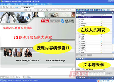 在將近4個小時的時間內,三位華清遠見講師細致、精彩的講解,實用的企業(yè)項目實戰(zhàn)的經驗分享令到場的各位朋友對3G手機開發(fā)領域內Android這個受人關注的操作系統(tǒng)有了更加清晰、直觀地了解和認識,同時對于3G這個新興領域內基于Android操作系統(tǒng)開發(fā)的典型應用案例、標準開發(fā)流程及各自的技術特點等也有了更加清楚的把握,講座中涉及專業(yè)內容和經驗的分享對3G手機開發(fā)的愛好者及初學者尤其具有指導意義。 3G Android名家大講堂全國同步推出 2009年11月26日,華清遠見3G移動開發(fā)名家大講堂通過網絡直播課堂的形式正式上線,來自全國各地的Andriod技術愛好者借助新穎的網絡課堂、足不出戶就有機會與華清遠見3G學院的著名講師進行實時互動,共同交流新移動開發(fā)技術的真實需求和企業(yè)應用。數(shù)百位在校學生和在職工程師在自己的宿舍或者辦公室內借助先進的網絡視頻系統(tǒng)與華清遠見的老師直接進行交流。在2010年1月28日該活動結束當天,許多朋友都紛紛要求華清遠見能夠在新的一年舉辦更多這樣的免費、在線視頻講座,讓外地的朋友也能夠有機會享受到華清遠見技術專家的獨特魅力!