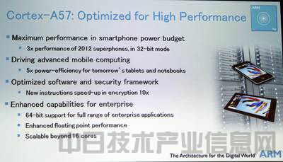 高性能產(chǎn)品用處理器Cortex-A57的主要特點:32位模式的性能為2012年的高性能智能手機的3倍,電力效率為平板電腦和筆記本電腦的5倍。還通過配備新指令提高了加密處理速度。