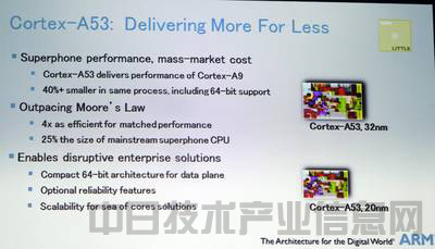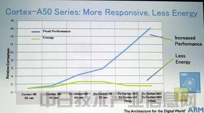 以高電力效率為賣點的Cortex-A53。性能與現(xiàn)有的Cortex-A9相同,但裸片尺寸縮小了40%。制造工藝為32nm和20nm。 就ARM等的嵌入式處理器支持64位處理的意義,Keith Clarke表示,“網(wǎng)絡(luò)和服務(wù)器支持64位處理的必要性不言自明。移動計算領(lǐng)域也出現(xiàn)了需要大容量存儲空間的應(yīng)用,而且畫面的高分辨率化不斷推進”,所以便攜終端也需要支持64位處理。 作為兼顧低耗電量和高性能的技術(shù),ARM發(fā)布了裝有低耗電和高性能兩種內(nèi)核,可相應(yīng)于負荷動態(tài)切換使用的“big.LITTLE”。據(jù)稱在A53和A57利用big.LITTLE,可以制成比以往峰值性能高且耗電量低的芯片。Keith Clarke稱,采用A50系列的產(chǎn)品預計“將于2014年供貨”。