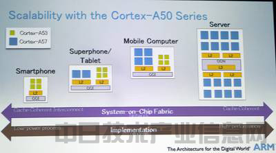 顯示出了A50系列可擴展性的構(gòu)成示例。有智能手機用四核A53處理器,平板電腦用組合了雙核A57和四核A53的處理器。向筆記本電腦將提供4個A57和4個A53組合的高性能處理器。向服務(wù)器將提供配備了三級緩存、采用16個A57的巨大處理器。 ARM系統(tǒng)設(shè)計部門高級副社長兼總經(jīng)理John Cornish介紹了針對服務(wù)器市場的舉措。服務(wù)器的用途和要求多種多樣,很難用一款處理器全部涵蓋。ARM瞄準的不是所有的服務(wù)器,而是Web服務(wù)器和云等中低負荷的用途。