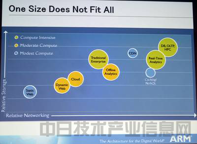 服務(wù)器的用途和負荷種類。越靠近右上方對運算性能的要求越高。ARM處理器要覆蓋的領(lǐng)域是,相對于絕對高的運算性能,更重視其與耗電量的均衡以及低耗電量的領(lǐng)域。 John Cornish提到了SNS(社交網(wǎng)絡(luò)服務(wù))的基礎(chǔ)設(shè)施和Web服務(wù)器的主機服務(wù)。他說:“提供這些服務(wù)的企業(yè),其利潤源就是服務(wù)器基礎(chǔ)設(shè)施。降低服務(wù)器的購買成本,或更換為低耗電量服務(wù)器與利潤直接相關(guān)。”一般而言,提供這些服務(wù)的企業(yè)愿意采用新技術(shù),因而比較容易涉足。