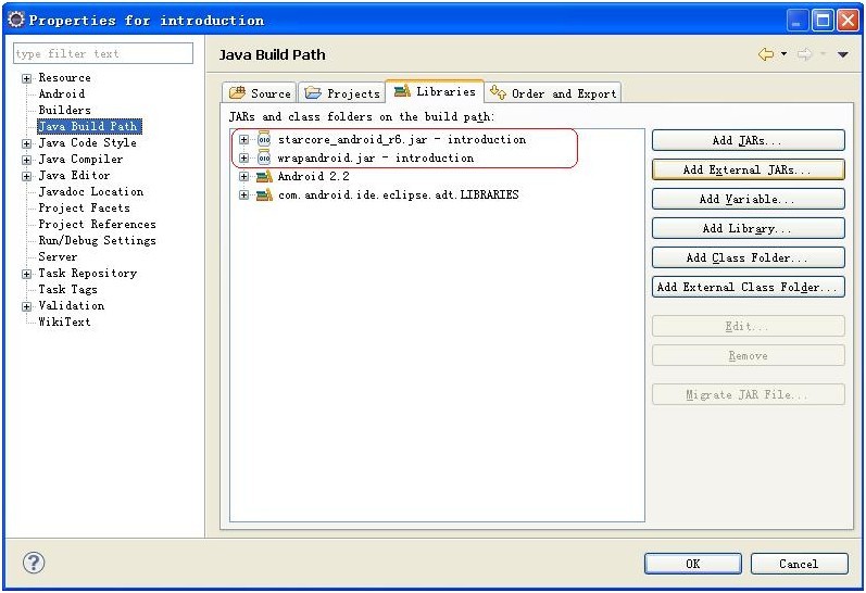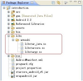 c. 將庫文件starcore_android_r6.jar和wrapandroid.jar到工程目錄下,將這兩個(gè)文件加入到工程中,如下圖: