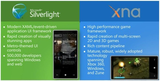 首先下載開發工具(WPDT)—>利用開發工具編寫相應的程序代碼并生成.xap文件—>在Windows Phone設備或模擬器上進行調試—>上傳到Marketplace由MS進行驗證,然后提供給客戶下載,當程序更新后,通過MS的云服務,也會將程序的更新信息提供給用戶。 1.開發平臺 Windows Phone的開發包括2大平臺,Silverlight平臺和XNA平臺