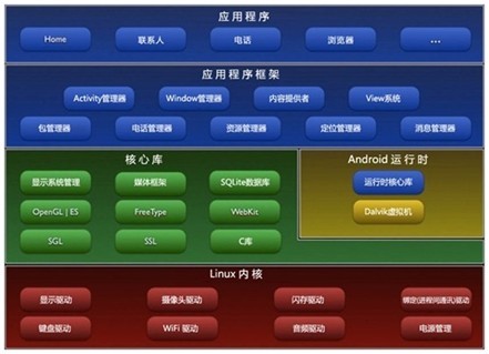 Android系統(tǒng)從下至上分為4層:Linux內(nèi)核、Android程序庫及Android運行時、Android應(yīng)用程序框架,以及應(yīng)用程序等。