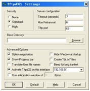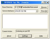 2.配置tftp服務(wù) tftp是一個(gè)傳輸文件的簡(jiǎn)單協(xié)議,它基于UDP協(xié)議實(shí)現(xiàn)。此協(xié)議設(shè)計(jì)時(shí)是進(jìn)行小文件傳輸?shù)模虼怂痪邆渫ǔ5腇TP的許多功能,只能從文件服務(wù)器上獲得或?qū)懭胛募荒芰谐瞿夸洠贿M(jìn)行認(rèn)證,只能傳輸8位數(shù)據(jù)。 tftp服務(wù)分為客戶(hù)端服務(wù)和服務(wù)器端服務(wù)兩種。通常,首先在宿主機(jī)上開(kāi)啟tftp服務(wù)器端服務(wù),設(shè)置好tftp的根目錄內(nèi)容(也就是供客戶(hù)端下載的文件),然后,在目標(biāo)板上開(kāi)啟tftp的客戶(hù)端程序(tftp客戶(hù)端主要在Bootloader交互環(huán)境下運(yùn)行,幾乎所有Bootloader都提供該服務(wù),用于下載操作系統(tǒng)內(nèi)核和文件系統(tǒng))。這樣,把目標(biāo)板和宿主機(jī)用直連線相連之后,就可以通過(guò)tftp協(xié)議傳輸可執(zhí)行文件。下面分別講述在Linux下和Windows下的配置方法。 1)Linux下的tftp服務(wù)配置 Linux下tftp的服務(wù)是由xinetd(還有openbsd-inetd等其他服務(wù))所設(shè)定的,默認(rèn)情況下是處于關(guān)閉狀態(tài)。 首先,要修改tftp的配置文件,開(kāi)啟tftp服務(wù),如下所示: $ vim /etc/xinetd.d/tftp 在這里,主要是要將“disable=yes”改為“disable=no”。另外,通過(guò)“server_args”可以看出,tftp服務(wù)器端的默認(rèn)根目錄為“/tftpboot”,用戶(hù)可以根據(jù)需要更改為其他目錄。 接下來(lái),重啟xinetd服務(wù),使剛才的更改生效,如下所示: $ /etc/init.d/xinetd restart 然后,使用命令“netstat -au”以確認(rèn)tftp服務(wù)是否已經(jīng)開(kāi)啟,如下所示: $ netstat –au | grep tftp 這時(shí),用戶(hù)就可以把所需的傳輸文件放到“/tftpboot”目錄下,這樣,主機(jī)上的tftp服務(wù)就建立起來(lái)。用網(wǎng)絡(luò)交叉線把目標(biāo)板和宿主機(jī)連起來(lái),并且將其配置成一個(gè)網(wǎng)段的地址,再在目標(biāo)板上啟動(dòng)tftp客戶(hù)端程序(注意:不同的Bootloader所使用的命令會(huì)有所不同,讀者可以查看幫助來(lái)獲得確切的命令名及格式,本書(shū)以U-Boot為例講解),如下所示: # tftp 0x30008000 zImage 可以看到,此處目標(biāo)板使用的IP為“192.168.1.120”,宿主機(jī)使用的IP為“192.168.1.112”,下載到目標(biāo)板的地址為0x33000000,文件名為“zImage”。 2)Windows 在Windows下配置tftp服務(wù)需要使用tftp服務(wù)器軟件,常見(jiàn)的有Tftpd32,讀者可以自行從網(wǎng)上下載。要注意的是,該軟件是tftp的服務(wù)器端,而目標(biāo)板上則是tftp的客戶(hù)端。打開(kāi)該軟件,如圖1.3所示。 接下來(lái),用戶(hù)可以在Settings中配置服務(wù)器端的各個(gè)選項(xiàng),如IP地址等,如圖1.4所示。 另外,還需要在Browse中選擇tftp的服務(wù)器端根目錄。這時(shí),tftpd會(huì)提示用戶(hù)重啟該軟件,使修改的參數(shù)生效。至此,tftp的服務(wù)就配置完畢。此時(shí)可以用直連線連接目標(biāo)機(jī)和宿主機(jī),且在目標(biāo)機(jī)上開(kāi)啟tftp服務(wù)進(jìn)行文件傳輸。