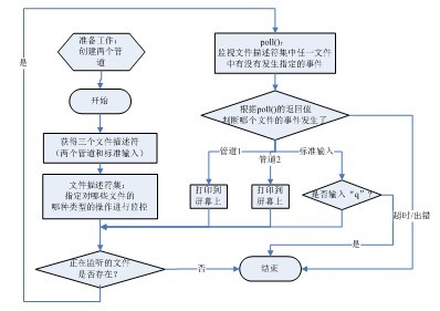 本實例中主要實現通過調用poll()函數來監聽三個終端的輸入(分別重定向到兩個管道文件的虛擬終端及主程序所運行的虛擬終端)并分別進行相應的處理。在這里我們建立了一個poll()函數監視的讀文件描述符集,其中包含三個文件描述符,分別為標準輸入文件描述符和兩個管道文件描述符。通過監視主程序的虛擬終端標準輸入來實現程序的控制(如程序結束);以兩個管道作為數據輸入,主程序將從兩個管道讀取的輸入字符串寫入到標準輸出文件(屏幕)。