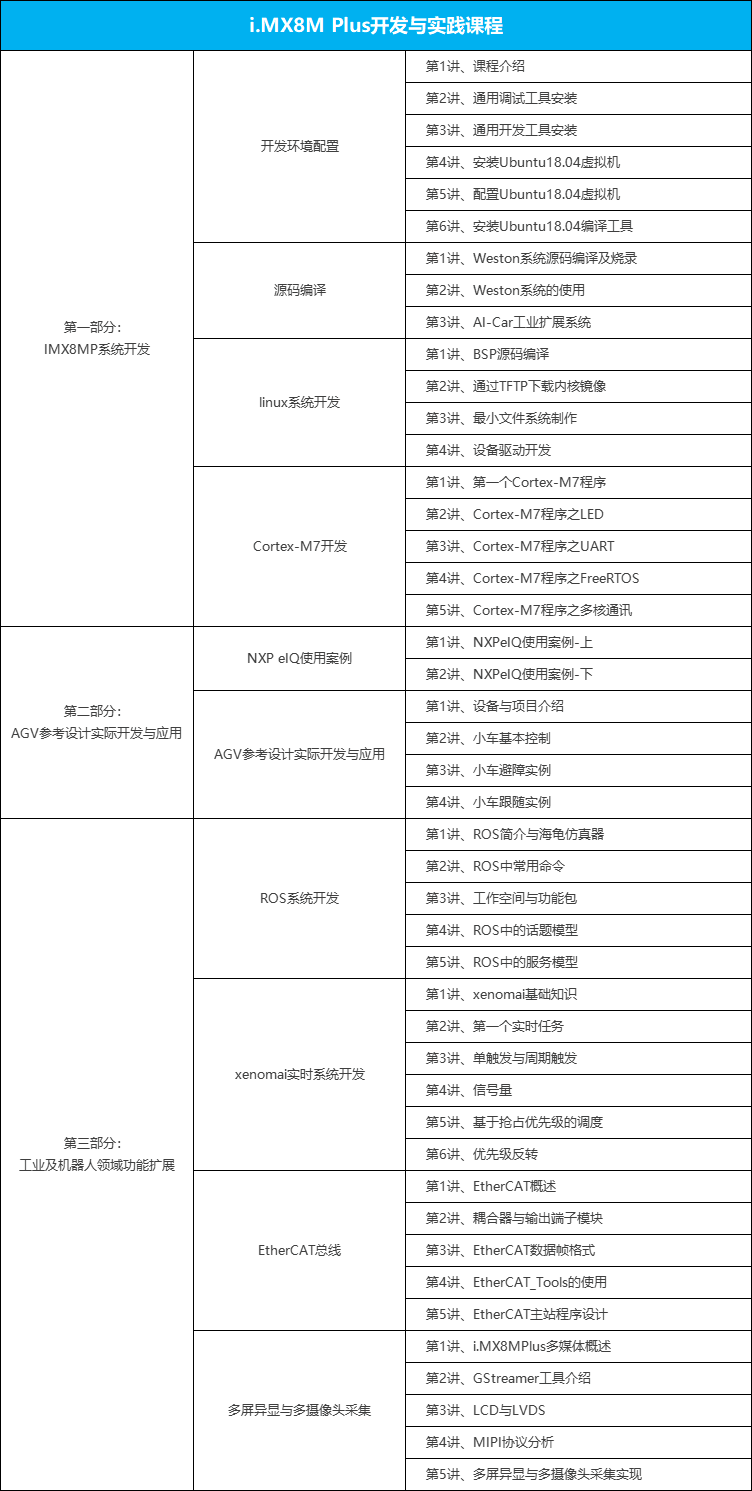 課程介紹: i.MX8M Plus應用處理器是NXP推出的一款致力于推動機器學習(ML),機器視覺,多媒體與工業邊緣物聯網應用的工業人工智能芯片。擁有4個ARM Cortex-A53核心,主頻可達1.8GHz,1個Cortex-M7核心,主頻800,MHz。內部集成了神經網絡加速單元(NPU),提供高達2.3TOPS的邊緣計算能力,能夠在工業和物聯網等領域為邊緣端的機器學習提供了強大的性能支撐。為了更好的學習這款芯片,華清遠見聯手NXP推出基于i.MX8M Plus的人工智能開發套件,并錄制了一套完整的課程《i.MX8M Plus開發與實踐課程》。這套課程主要是面向工程師級別,含金量比較高,包含了實時Linux操作系統、人工智能、EtherCAT工業總線、多屏異顯、多攝像頭輸入、ROS機器人操作系統、AGV自主導航智能車等眾多前沿技術。