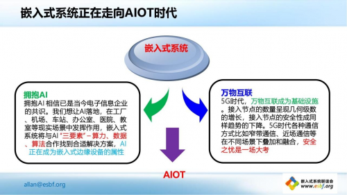 嵌入式系統(tǒng)知名專家、嵌入式系統(tǒng)聯(lián)誼會秘書長何小慶先生發(fā)表了主題為《嵌入式處理器和軟件技術(shù)發(fā)展趨勢》的演講,聲情并茂的為大家講解了嵌入式系統(tǒng)和軟件的四個發(fā)展歷程。他預(yù)測,行業(yè)未來的發(fā)展遠(yuǎn)景將是“擁抱AI”和“萬物互聯(lián)”。物聯(lián)網(wǎng)時代的崛起催生出物聯(lián)網(wǎng)操作系統(tǒng),將繼而衍生出AI芯片。因此,LoT原有系統(tǒng)將面臨大考,功能安全和信息安全成為最重要的課題。