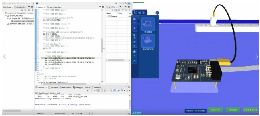 以3D模型1:1還原了嵌入式硬件系統(tǒng)和豐富的傳感器和執(zhí)行器,模擬了真實(shí)的硬件和項(xiàng)目應(yīng)用場景,把多個(gè)硬件都放在仿真軟件里,脫離硬件去教學(xué)。通過原理圖仿真、PCB仿真流程圖仿真、工程源碼3D仿真等將其軟硬件開發(fā)內(nèi)容展開,能夠讓學(xué)生在無需實(shí)際硬件的情況下,通過模擬界面來學(xué)習(xí)和實(shí)驗(yàn)。老師能夠輕松引導(dǎo)學(xué)生探索不同硬件組件的功能與交互,并且根據(jù)實(shí)際教學(xué)需求快速切換不同的硬件配置進(jìn)行教學(xué)演示,降低硬件成本和管理復(fù)雜度的同時(shí)還提高了教學(xué)效率。