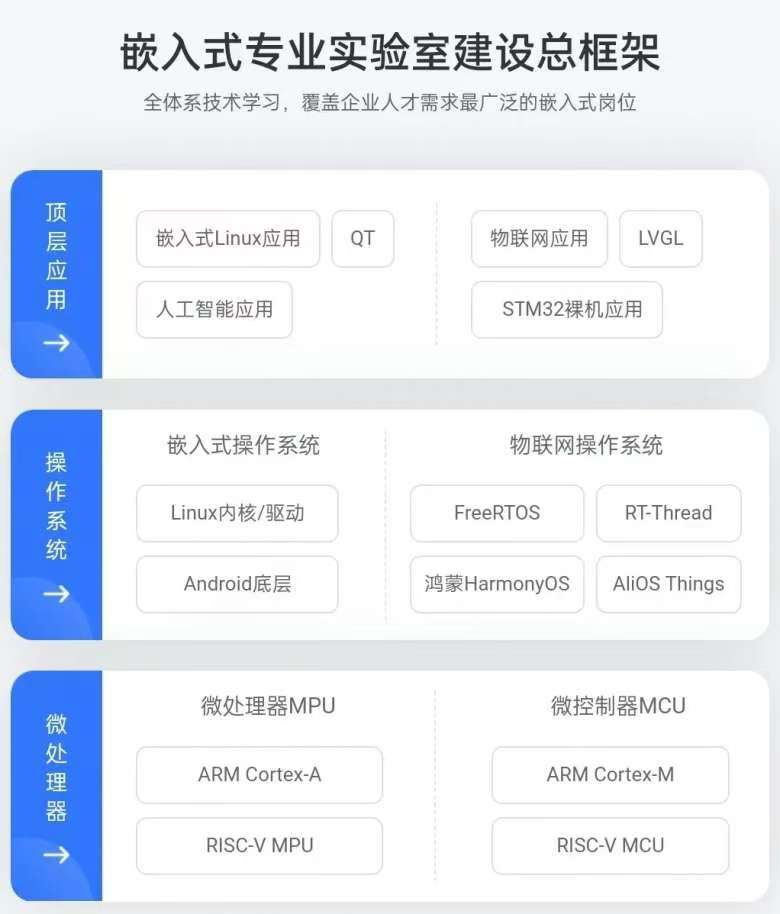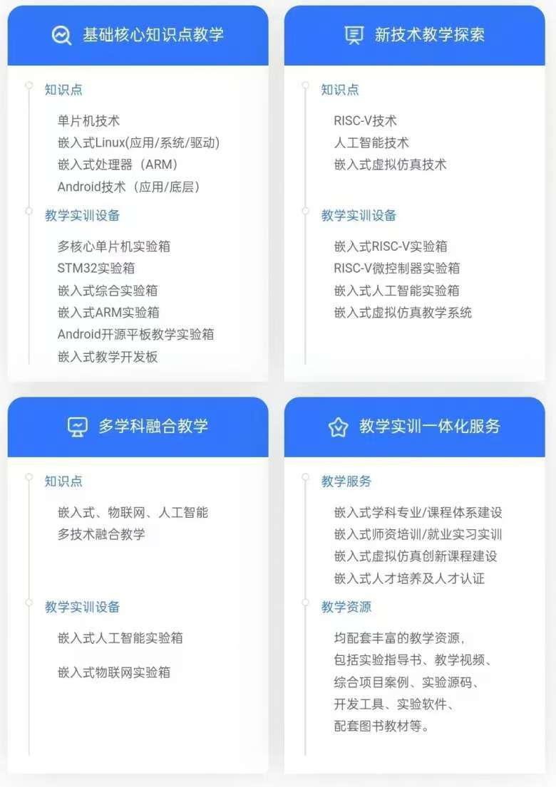 華清遠(yuǎn)見嵌入式實(shí)驗(yàn)室建設(shè)方案,不僅滿足基礎(chǔ)及項(xiàng)目教學(xué)實(shí)訓(xùn)需求,還不斷探索多學(xué)科融合教學(xué),以硬核研發(fā)實(shí)力,推進(jìn)高校嵌入式相關(guān)課程教學(xué)改革及教學(xué)實(shí)踐,促進(jìn)了教育與產(chǎn)業(yè)的緊密合作。