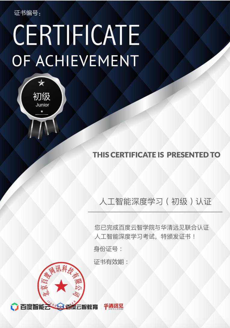 華清遠(yuǎn)見和百度云合作由來已久,在人工智能人才培方向有著全方位的戰(zhàn)略合作,如:百度嵌入式人工智能認(rèn)證(含初級(jí)、中級(jí)、高級(jí)、大師級(jí))等。今年華清遠(yuǎn)見又成為百度云人工智能深度學(xué)習(xí)工程應(yīng)用試點(diǎn),學(xué)員通過對(duì)應(yīng)課程及考試認(rèn)證后可獲得《人工智能深度學(xué)習(xí)(初級(jí))認(rèn)證證書》。
