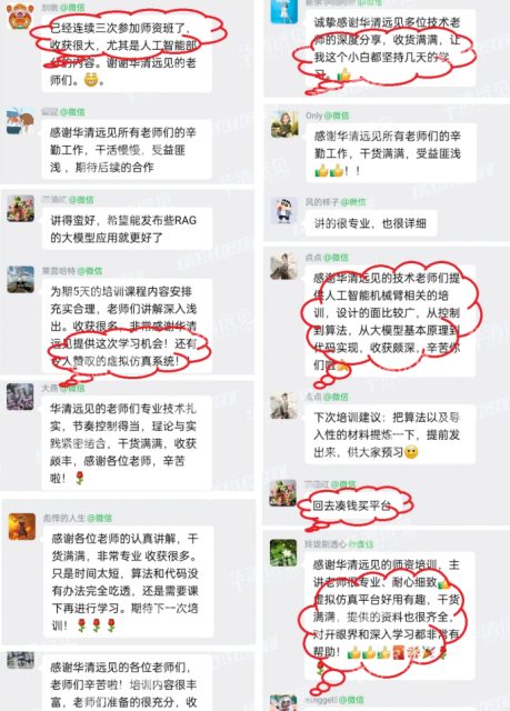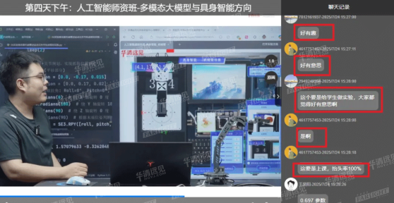 本次暑期師資班聚焦“多模態大模型+具身智能”這一AI前沿技術方向,并依托華清遠見元宇宙實驗中心人工智能虛擬仿真平臺全新升級的“具身智能機械臂”3D場景化項目教學系統,為教師們帶來了全新的跨模態教學實踐體驗。培訓反饋熱烈,體系化的實戰課程及高效直觀的教學方式,獲得了全國眾多高校老師的高度認可與廣泛好評。