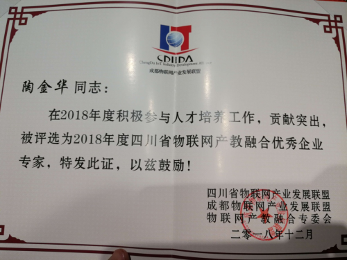 會議上,物聯(lián)網(wǎng)產(chǎn)教融合專委會的多名成員分別匯報了2018年專委會工作情況和物聯(lián)網(wǎng)產(chǎn)教融合專家工作站項目與人才白皮書工作進(jìn)展,各位企業(yè)大咖及高校代表依次做了主題分享。大會還進(jìn)行了優(yōu)秀企業(yè)專家的評選及頒獎儀式,華清遠(yuǎn)見區(qū)域運營副總裁兼校長陶金華老師在此次大會上榮獲“2018年度四川省物聯(lián)網(wǎng)產(chǎn)教融合優(yōu)秀企業(yè)專家”獎項。
