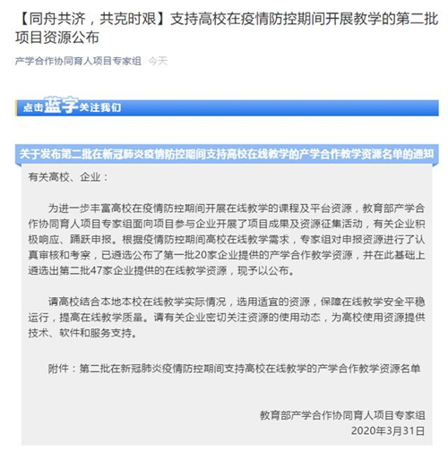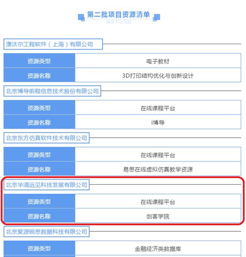 近日,教育部高等教育司公布了2020年第二批在新冠肺炎疫情期間支持高校在線教學的產學合作教學資源名單,華清遠見教育集團旗下在線課程平臺"創客學院"成功入選。