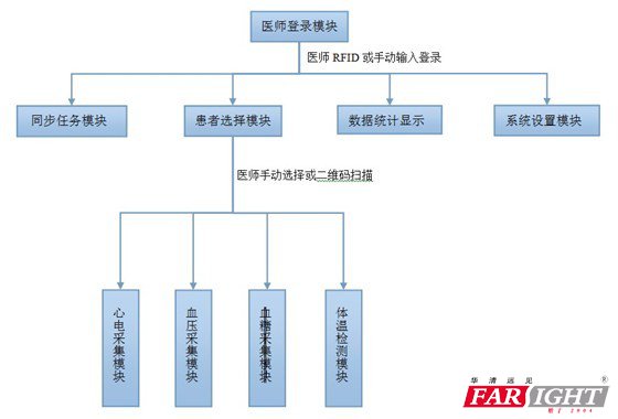 智能醫療系統主要包括:登錄模塊、同步任務模塊、患者選擇、系統設置模塊、數據統計顯示模塊、心電采集模塊、血壓采集模塊、血糖采集模塊、體溫檢測模塊。