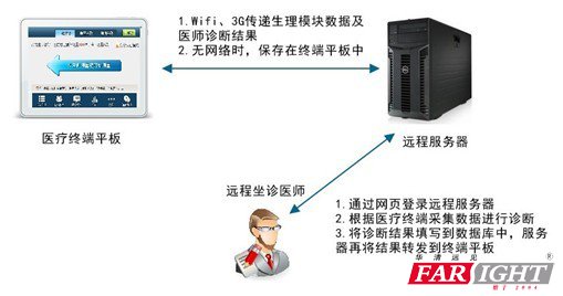 便攜式智能醫療系統采用先進診療傳感器用于采集患者數據信息,將數據交給醫療終端平板設備,醫療終端用于基礎信息顯示及診斷結果統計, 醫療終端會將患者采集的信息通過網絡發送到遠程醫療服務器,服務器用于保存患者信息及專業醫師對患者病情進行診斷及診斷結果反饋,患者可以通過醫療終端查 看醫師反饋結果。