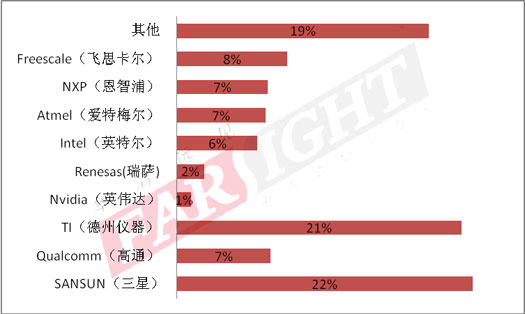 據(jù)調(diào)查統(tǒng)計(jì)數(shù)據(jù)的結(jié)果顯示,TI(德州儀器)和SAMSUNG(三星),成為受開發(fā)者歡迎的嵌入式處理器芯片提供商,占據(jù)了接近一半(43%)的市場(chǎng)份額,其他知名廠家處理器芯片所占市場(chǎng)份額分布為:Freescale(飛思卡爾)8%、Qualcomm(高通)7%、NXP(恩智浦)7%、Atmel(愛特梅爾)7%、Intel(英特爾)6%、Renesas(瑞薩)2%、Nvidia、(英偉達(dá))1%、,除以上廠家之外的其他處理器則占總體市場(chǎng)份額的19%。值得一提的是Freescale(飛思卡爾)的芯片占比例今年有大幅度提升。