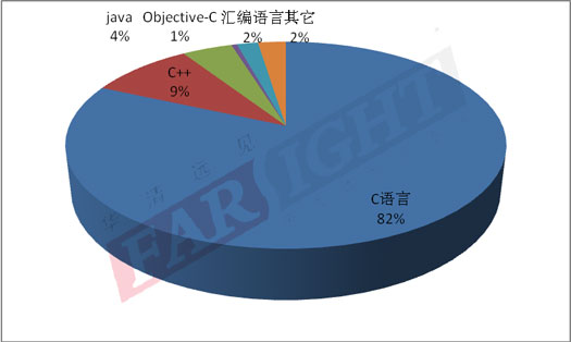 我們從2013-2014年度華清遠(yuǎn)見的調(diào)查統(tǒng)計(jì)數(shù)據(jù)中可以看出,C語言仍是在嵌入式產(chǎn)品研發(fā)的軟件開發(fā)語言的使用過程中普遍使用的語言,其市場(chǎng)份額繼續(xù)保持(82%),這一統(tǒng)計(jì)結(jié)果再一次表明,無論是在傳統(tǒng)的工業(yè)控制領(lǐng)域、通信領(lǐng)域,還是迅猛發(fā)展的消費(fèi)電子,安防控制、信息家電等領(lǐng)域,C語言均是嵌入式開發(fā)語言的首選。對(duì)比去年的調(diào)研數(shù)據(jù), Objective-C的使用比例有所下降,究其原因不難看出,Android智能手機(jī)的大量生產(chǎn)和推廣推動(dòng)了java語言的廣泛使用,成為在嵌入式領(lǐng)域內(nèi)受歡迎的高級(jí)語言,而iOS智能手機(jī)操作系統(tǒng)的開發(fā)雖一定程度上拓展了Objective-C語言的開發(fā)人群,但是由于iOS系統(tǒng)所應(yīng)用范圍的局限性,造成了總體比例降低。另外,C++所占比例為9%,位列第二,匯編語言占2%,跟去年相比降低1個(gè)白分點(diǎn)。