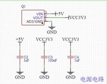 本STM32最小系統上的電源電路使用了AMS1117-3.3V模塊,屬于典型的降壓電源電路。將輸入的 5V 電壓進行降壓,最終輸出需要使用的 3.3V 電壓。電源電路如圖3所示。